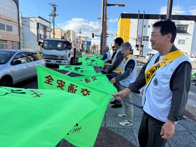 秋の交通安全運動「人の波・旗の波」街頭啓発に参加し、交通安全を呼びかけました。